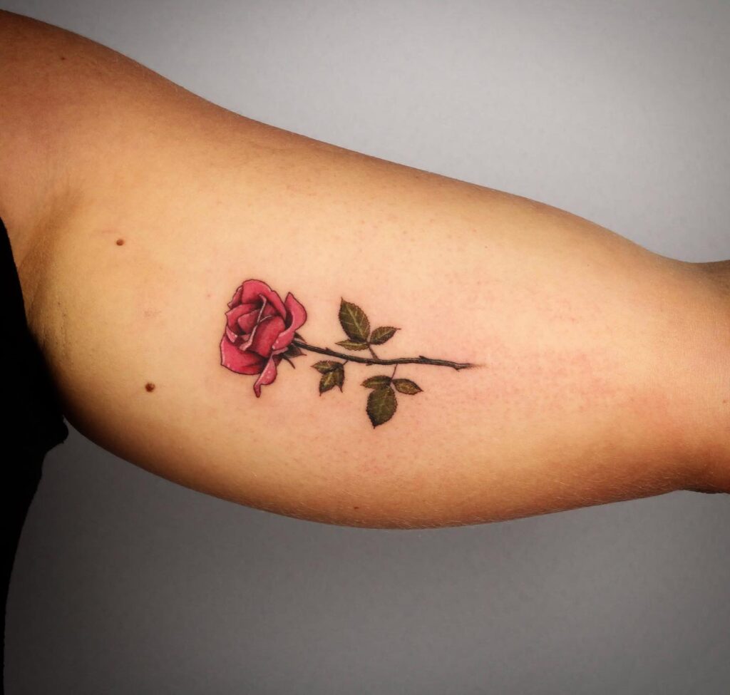 This simple yet striking bicep tattoo features a single red rose with a long green stem and subtle leaves. The vibrant petals stand out beautifully against the skin, while the natural green tones in the stem and leaves add realism.