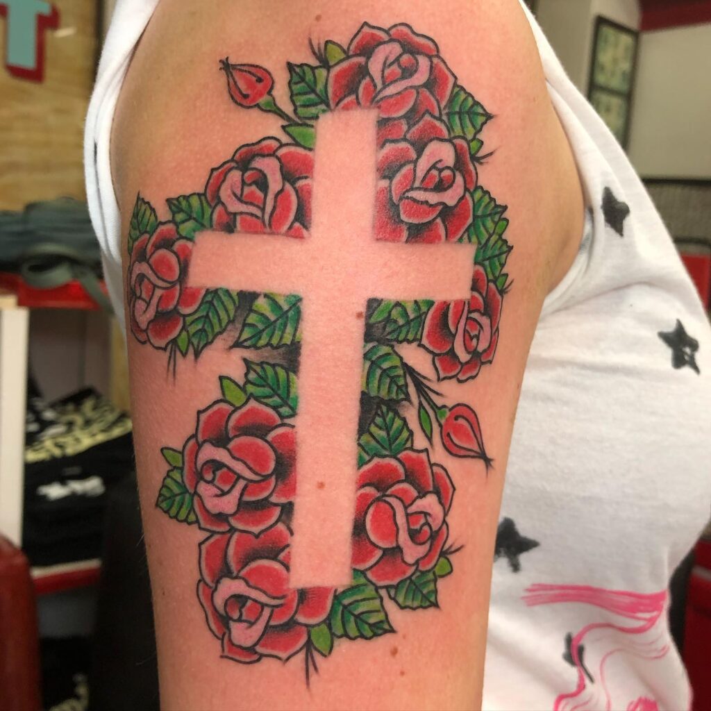 This vibrant upper arm tattoo features a bold cross created entirely through clever negative space, surrounded by vivid red roses and green leaves. The rich shading and bright colors make the floral design pop against the skin, allowing the clean silhouette of the cross to stand out as the centerpiece.