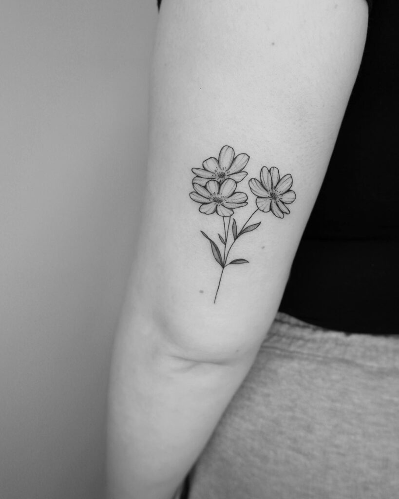 This elegant upper arm tattoo features a graceful trio of wildflowers in fine black ink. Soft petals and slender stems are rendered with light shading, creating a gentle and timeless look. The simple design feels airy and minimal, allowing each bloom to stand out naturally.