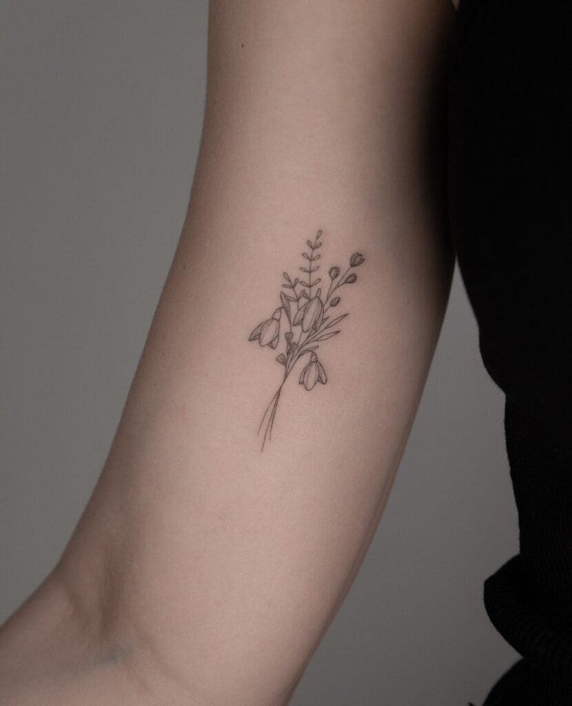 This delicate upper arm tattoo features a small, minimalist bouquet of wildflowers rendered in fine-line black ink. Tiny blooms and sprigs gracefully cluster together, with slender stems gently curving downward for a natural and subtle feel.
