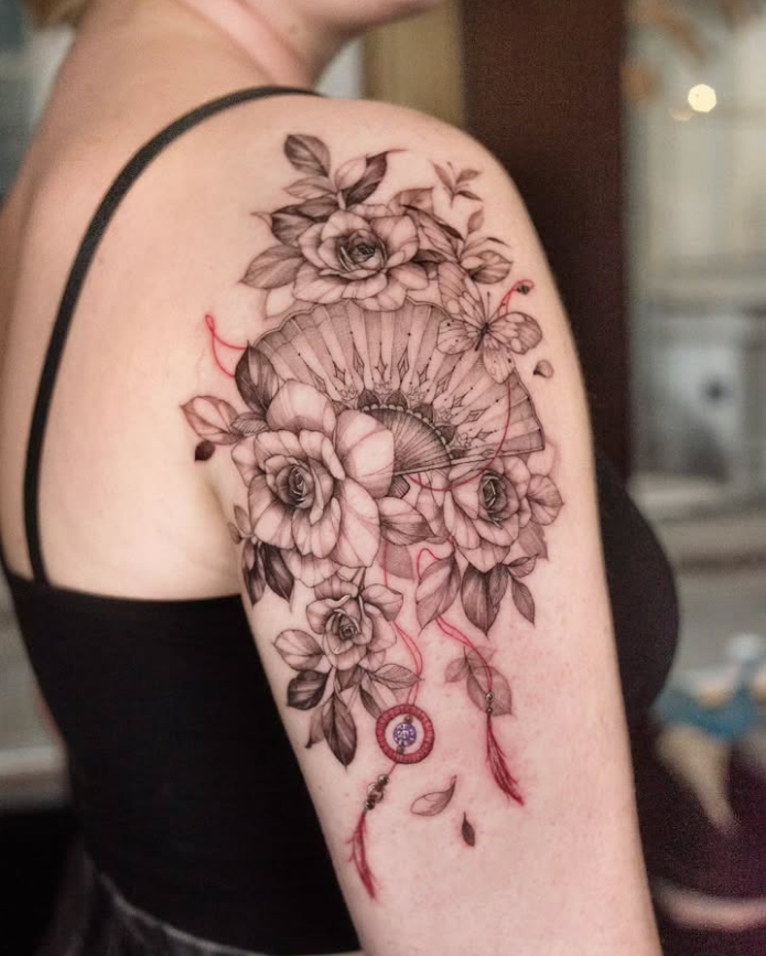 This intricate upper arm tattoo features a graceful Korean-style fan surrounded by lush, blooming roses. Delicate shading brings the petals to life, creating a soft and elegant feel. Tiny butterflies and fine red thread-like accents add movement and symbolism of connection and luck.