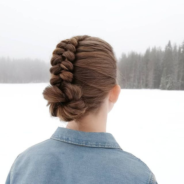The low infinity braid bun combines elegance and practicality, making it a great choice for snowboarding. This intricate style begins with an endless braid that creates a visually striking pattern and ends with a low bun that holds hair securely and out of the way. This hairstyle is ideal for wearing under a helmet and offers sophisticated look and functionality for an active day on the slopes.