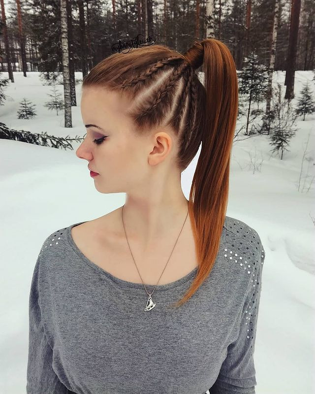 A high ponytail with braids is a graceful and dramatic hairstyle that is perfect for the slopes. This style combines the practicality of a high ponytail with the intricate detailing of braids braided close to the scalp on the sides. Braids hold your hair in place and give it a stylish look, while a high ponytail allows you to keep hair away from your neck and face. This look stays under the helmet and is a bold fashion look, making it perfect for snowboarders who want a chic and functional hairstyle.