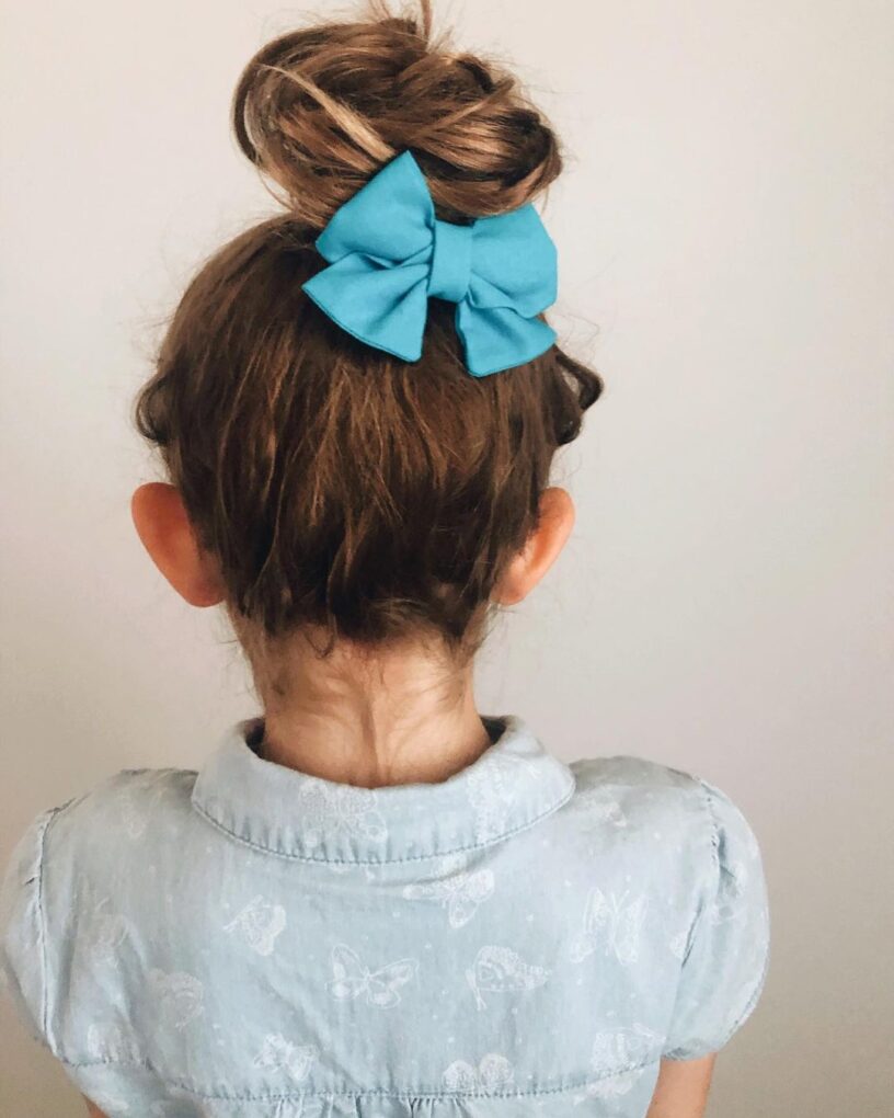 Upgrade your back-to-school style with a sparkly top knot with a trendy bow that effortlessly combines sophistication and playfulness while keeping your hair styled neatly for the day ahead.