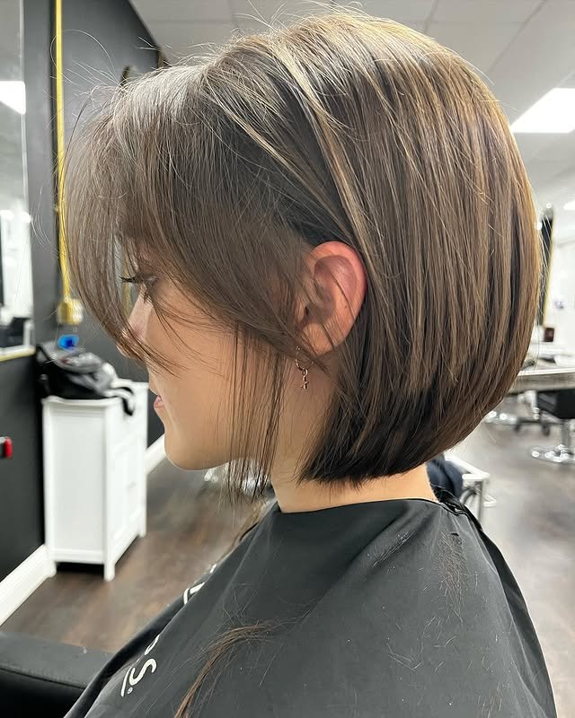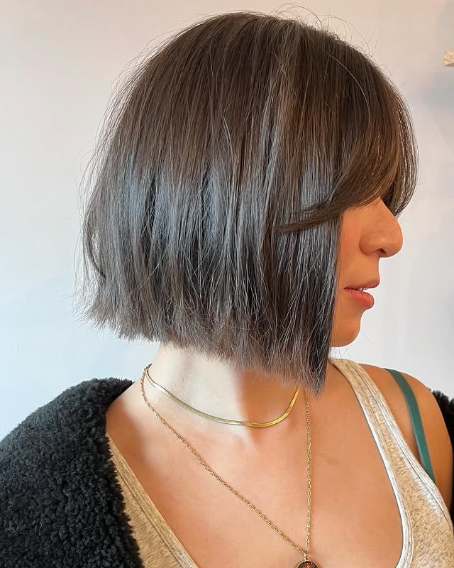 A lob with side bangs softens and adds volume to fine hair, drawing attention to the eyes and cheekbones. Bangs add movement and help separate the length, giving the haircut a fuller, more balanced look. It’s flattering, face-framing, and subtly voluminous—a timeless fashion option.