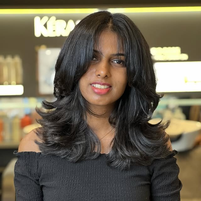 The airy butterfly haircut consists of cascading layers that imitate the wings of a butterfly: light, flowing and full of movement. This hairstyle is a dream for fine hair and adds lift to the crown and softness around the face. The medium length makes the hairstyle universal, and the multi-layer structure gives the hair elasticity and volume. It’s light, feminine and effortlessly flattering.