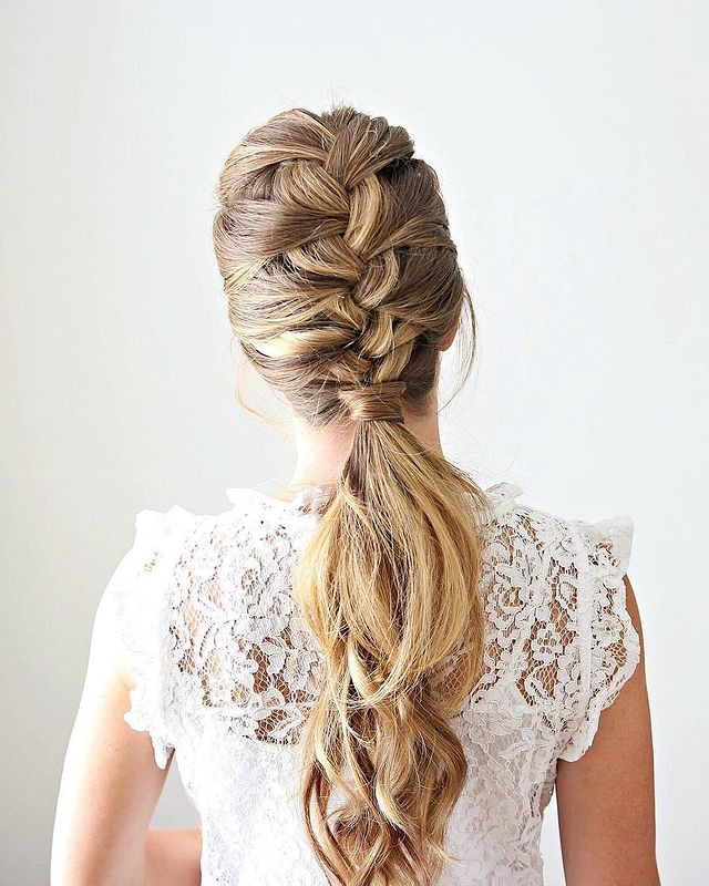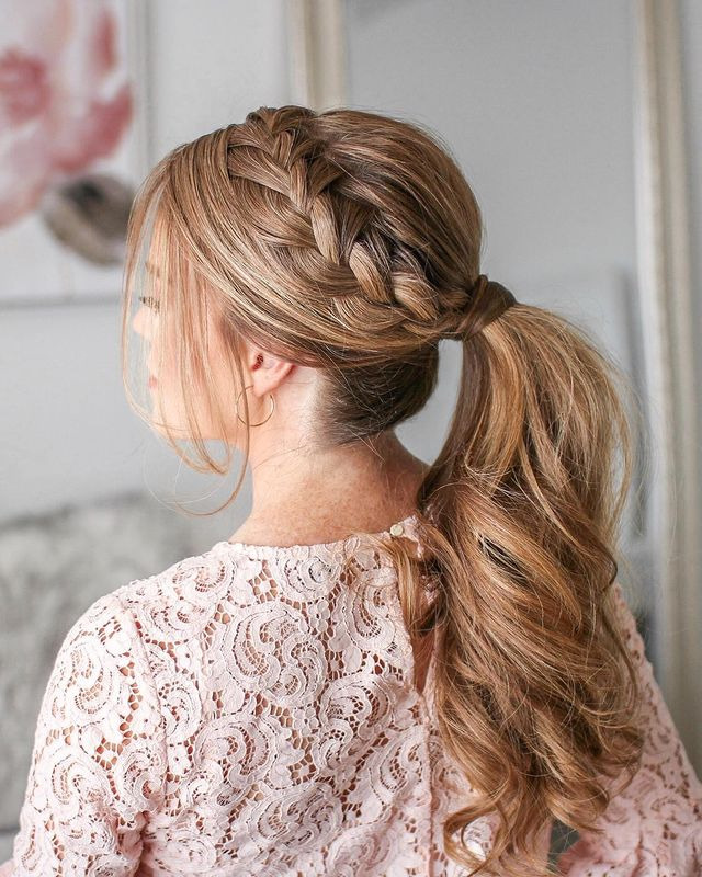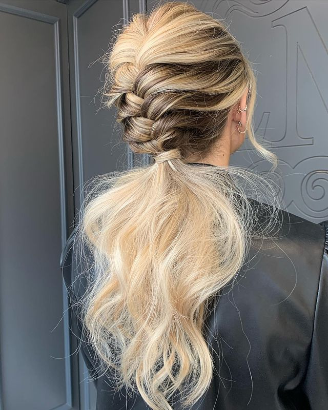A French braid ponytail with waves combines the structure of a French braid with soft, loose waves. The braid starts at the top of the head and goes into a voluminous wavy ponytail, creating a beautiful contrast. This glamorous yet casual style is perfect for formal events and casual outings.