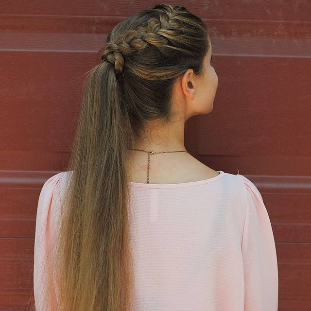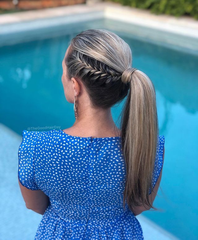 A chic ponytail with a French braid will create a stylish and graceful look for any occasion. This hairstyle features a tight French braid that starts at the crown and ends in a sleek, voluminous ponytail. The neatness of the braid and the fullness of the ponytail create a striking contrast, emphasizing the texture and length of the hair. This chic style combines elegance and contemporary style, ideal for casual and formal occasions, providing a sophisticated and eye-catching appearance.