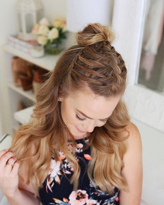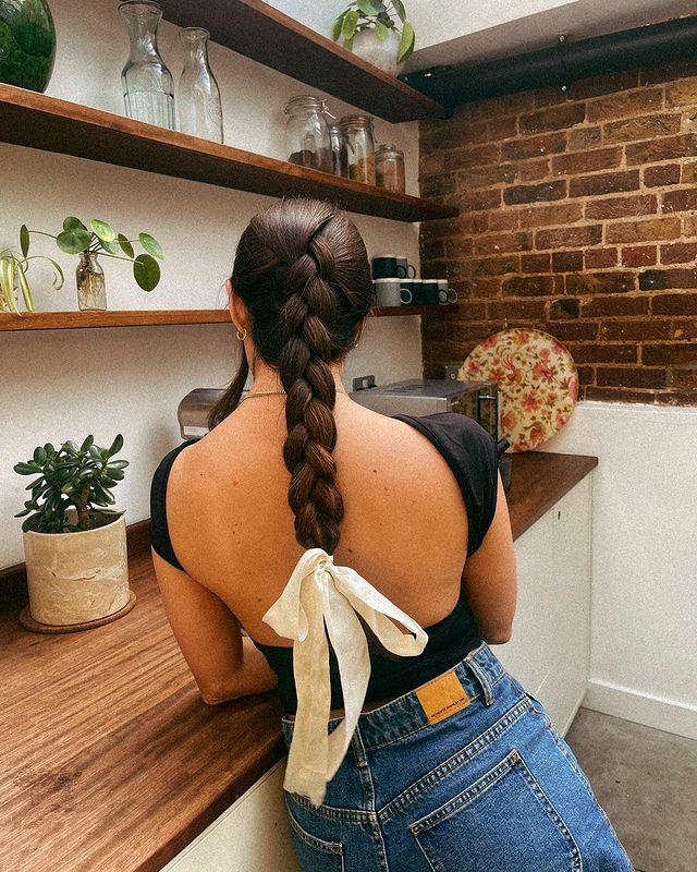 A French braid ponytail with a ribbon will give your hairstyle a fun and feminine look. This look features a French braid that flows into a sleek ponytail accessorized with a delicate ribbon. The ribbon enhances the charm of the braid and gives it a stylish and whimsical look. This hairstyle effortlessly combines elegance and creativity.