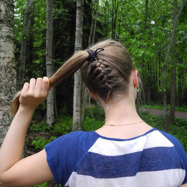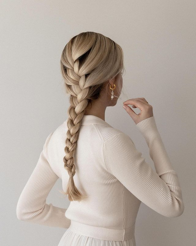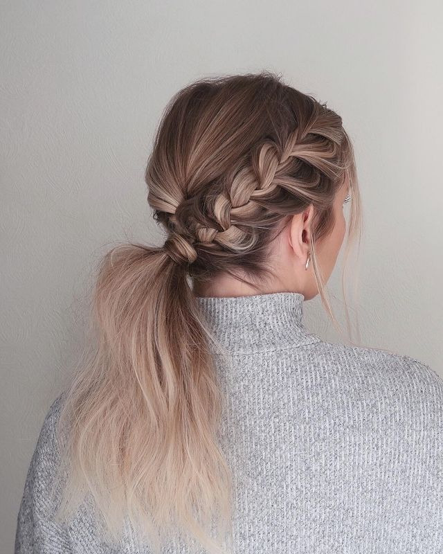 An inverted ponytail with a French braid is a unique and dynamic hairstyle that adds a twist to the classic ponytail. In this look, the French braid starts at the back of the neck and moves up into a high ponytail. An inverted braid adds an unexpected look and texture, making this hairstyle perfect for active days or casual outings. This is a stylish way to keep your hair secure while creating a creative and playful braid.