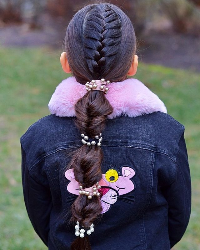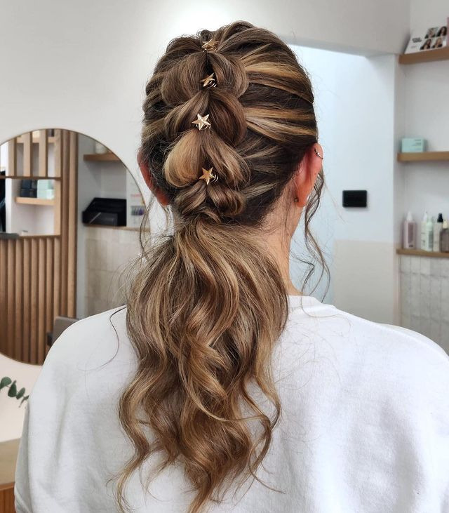 A ponytail with a French braid and star-shaped accessories will add shine and charm to your hairstyle. This look features a French braid that flows into a wavy ponytail, adorned with star-shaped accessories throughout the braid. The added stars give a whimsical and glamorous look, making this hairstyle perfect for casual and festive occasions. This is a stylish and fun way to dress up a classic braid.