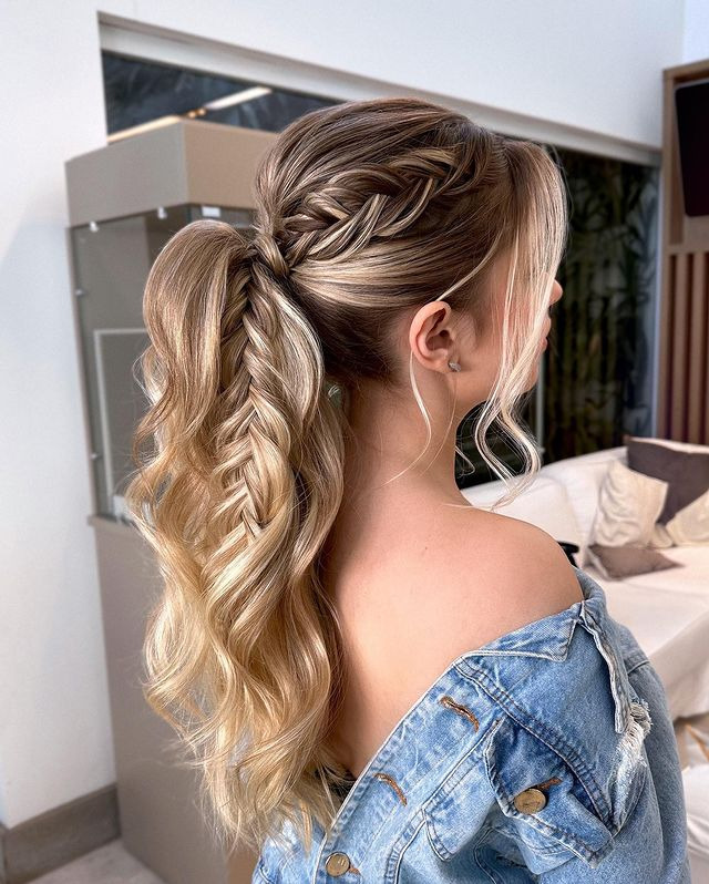 The French braided fishtail ponytail perfectly combines an intricate braid with a relaxed, flowing ponytail. This hairstyle is a fishtail braid that starts at the top of the head and flows smoothly into a loose, voluminous ponytail. The detailed braid at the top adds sophistication, while the wavy ponytail creates a carefree and romantic vibe.