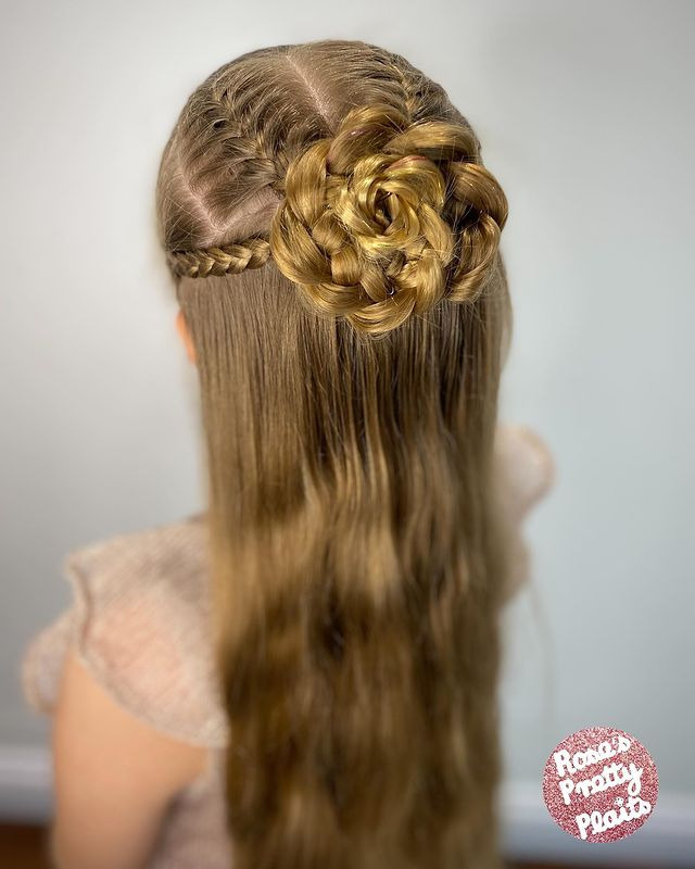 A flower bun with a French braid is a whimsical and elegant hairstyle that consists of two French braids that form a beautiful flower-shaped bun. This style adds playfulness and sophistication, perfect for special occasions or adding a unique touch to your everyday look. The combination of braids and an intricate bun creates a stunning visual effect, making the hairstyle stand out.