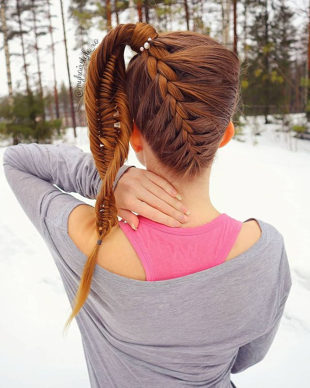The French braided fishtail ponytail combines the complex beauty of a fishtail braid with the simplicity of a ponytail. This hairstyle features a fishtail braid that starts at the front, wraps around the head, and ends in a voluminous, textured ponytail. The braid adds a touch of sophistication, while the full ponytail creates a playful and casual vibe.