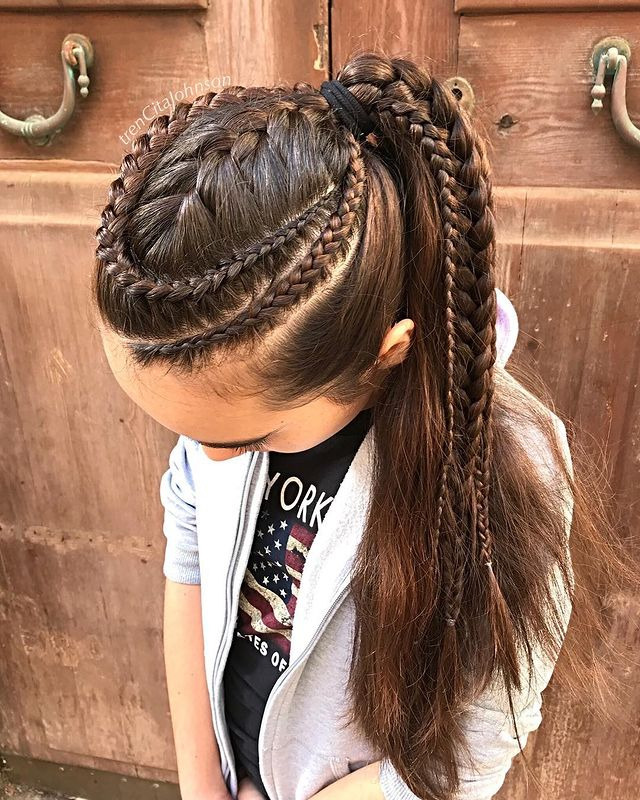 This hairstyle consists of two feathered braids that fade into a French braid that fades into a sleek ponytail. Feathered loops add texture and intricacy for a visually stunning effect. This look combines elegance and uniqueness and is ideal for casual and formal occasions.