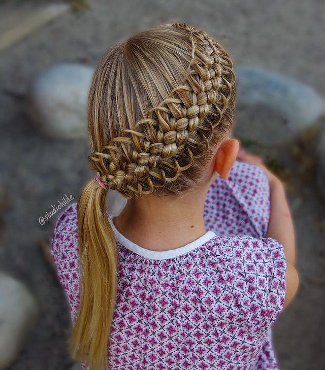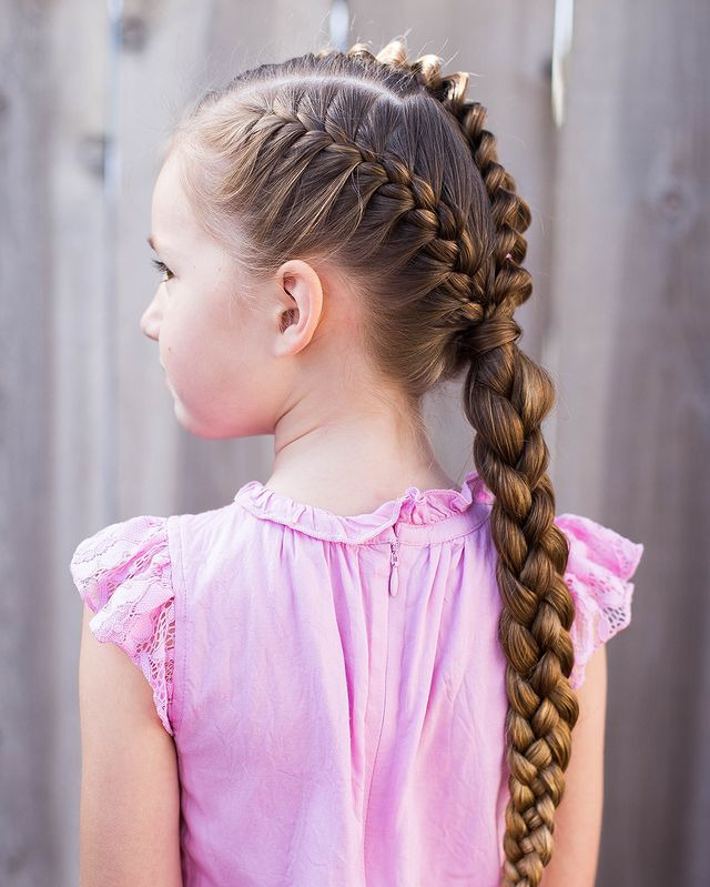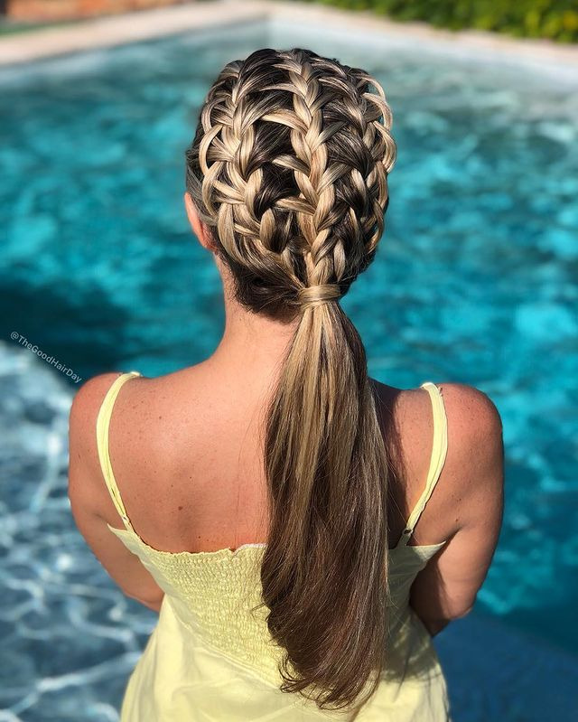 This hairstyle consists of two French braids that flow into one intricate four-strand ponytail. Combining a classic French braid with a unique four-strand braid creates a textured and visually appealing look. This look is perfect for keeping your hair neat and stylish and is perfect for both everyday use and special occasions.