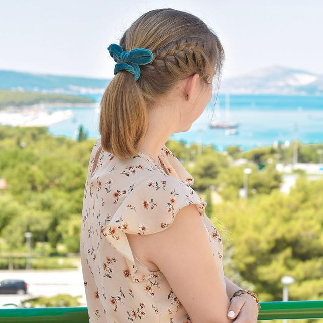 A French braid ponytail with a scrunchie is a charming and practical hairstyle that combines elegance with a hint of nostalgia. In this look, a French braid starts at the front and ends in a low ponytail secured with a colorful hair tie. The scrunchie adds playfulness and style, making this hairstyle perfect for a casual or casual outing. This is an easy way to keep your hairstyle clean by adding a fashionable accessory.
