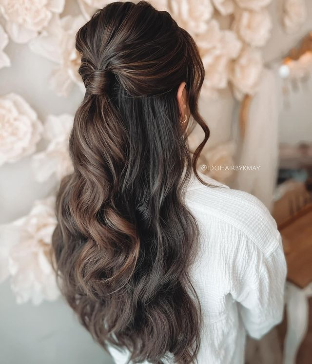A half up ponytail with polished waves is a chic and sophisticated hairstyle. It involves pulling the top half of your hair into a sleek ponytail while letting the rest of your hair fall in sleek, polished waves. This style offers the perfect balance of elegance and modernity, making it suitable for both casual outings and formal events.