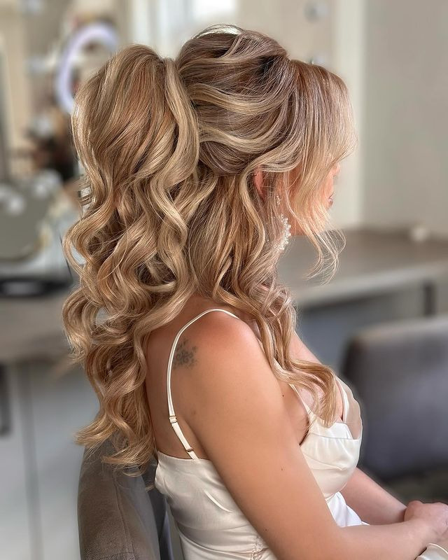 A half up, half down ponytail with curls enhances the natural beauty and texture of your hair. By pulling the top part into a ponytail and leaving the curls cascading down, you will create a stunning and dynamic look that is perfect for any event.