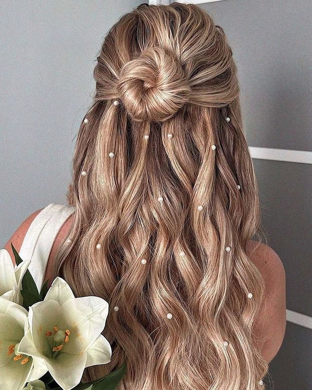 A half-up ponytail tied into a bun with pearl accents will add sophistication and charm to your hairstyle. By twisting the top section of your hair into a bun adorned with subtle pearl accents, you’ll create a timeless and elegant look that’s perfect for a wedding, party, or any glamorous event.