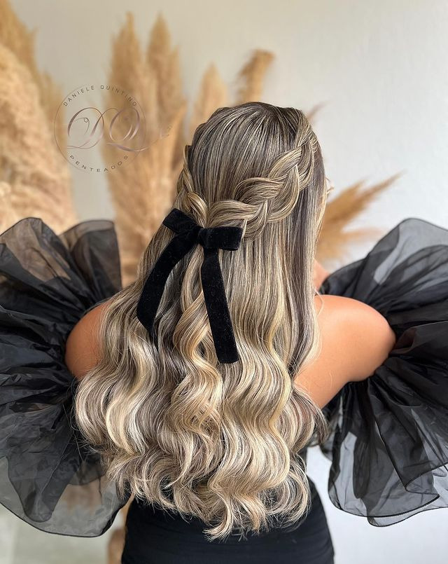 An inverted braid, half pressed half up, tied with a bow creates a unique and intricate hairstyle. Braid an inverted braid at the top of your hair and tie it off for a stylish and playful look that will turn heads.