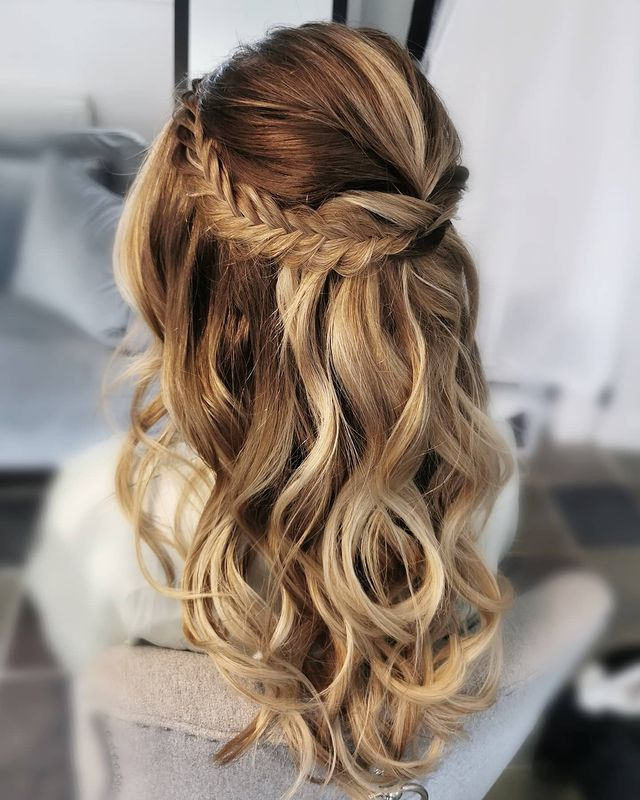 A half up, half down braided ponytail creates a regal and romantic hairstyle. By braiding the top section of your hair into a ponytail and braiding the rest into a half-up ponytail, you will create an elegant and sophisticated look that is perfect for a wedding, prom, or any special occasion.