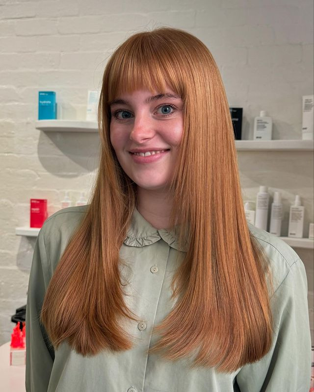 This hairstyle features long straight hair paired with bold straight bangs for a fresh and modern look. Sleek, consistent lengths give hair shine and sleekness, while straight bangs give it a dramatic, youthful look. This style is perfect for making a statement, suitable for any season and easily frames the face, drawing attention to the eyes.