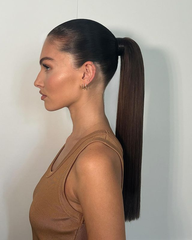 This tall, sleek, straight ponytail exudes elegance and sophistication. The smooth, polished surface and high position create a chic, streamlined look, ideal for casual and formal settings. This classic and versatile hairstyle is perfect for showcasing your hair’s natural shine and health, making it a suitable option for any occasion.