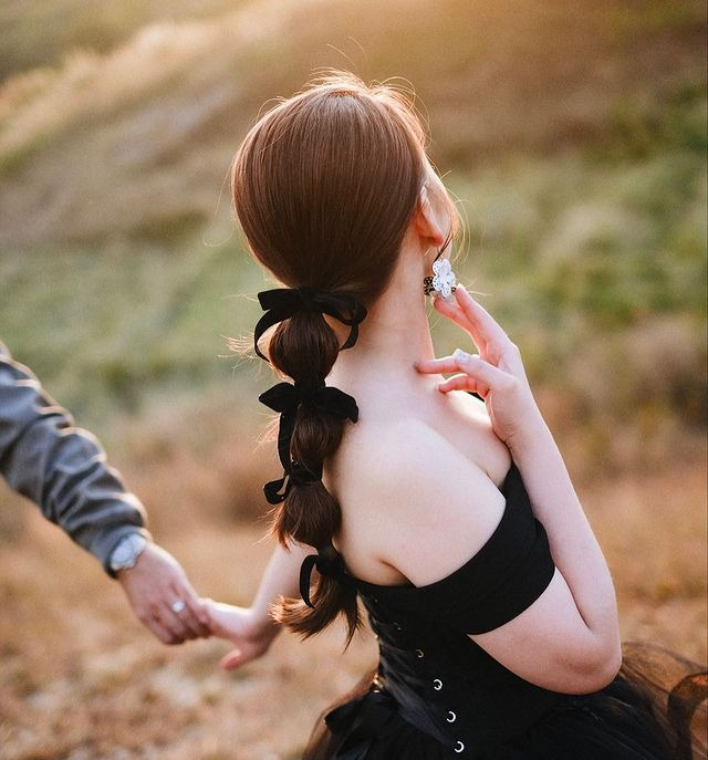 This romantic hairstyle features sleek, straight hair styled in a graceful low bun, accessorized with a delicate ribbon. The sleek finish of straight hair adds sophistication, while the ribbon adds a touch of femininity and charm. This elegant style is perfect for any season, special occasions, weddings or any event where you want to exude timeless grace.