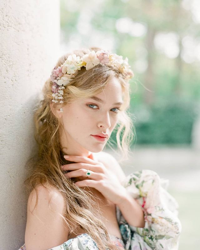 Create a whimsical bohemian vibe with a festive flower crown. This charming accessory will add color and a touch of nature to your wedding look and is perfect for an outdoor or garden wedding. Whether you choose bold, bright flowers or soft, delicate flowers, a flower crown is a stunning way to add romance and personality to your wedding. Paired with loose waves or a relaxed updo, it creates the perfect, ethereal, timeless, modern aesthetic.