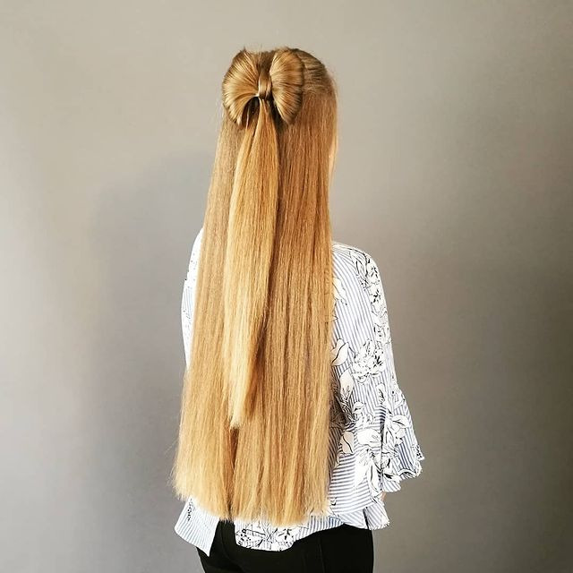 This adorable bow half updo gives a playful yet sophisticated look to long straight hair. A bow created from the hair itself is the centerpiece of this look, giving it a unique and elegant look. The rest of the hair falls down in sleek, sleek strands, emphasizing length and shine. This look is perfect for those who want to leave their hair down but still show off a stylish hairstyle. This look is perfect for special occasions or adding a little edge to your everyday style.