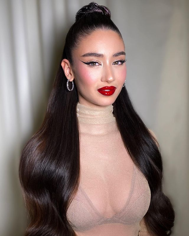 This stunning hairstyle is a voluminous half-up with flowing, well-defined curls. Hair is teased at the crown to add height and drama, while loose curls create a luxurious, textured look. Perfect for a glamorous evening, this style combines sophistication and edginess, highlighted by deep, rich hair color and bold makeup.