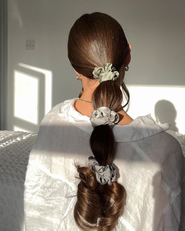 This stylish and fun bubble ponytail is created by securing strands of hair with several elastic bands, resulting in a series of bubbles along the entire length of the ponytail. Each scrunchie adds color and texture while keeping the overall look sleek and polished. This look is trendy and easy to pull off, perfect for casual outings or adding a playful twist to your everyday style.