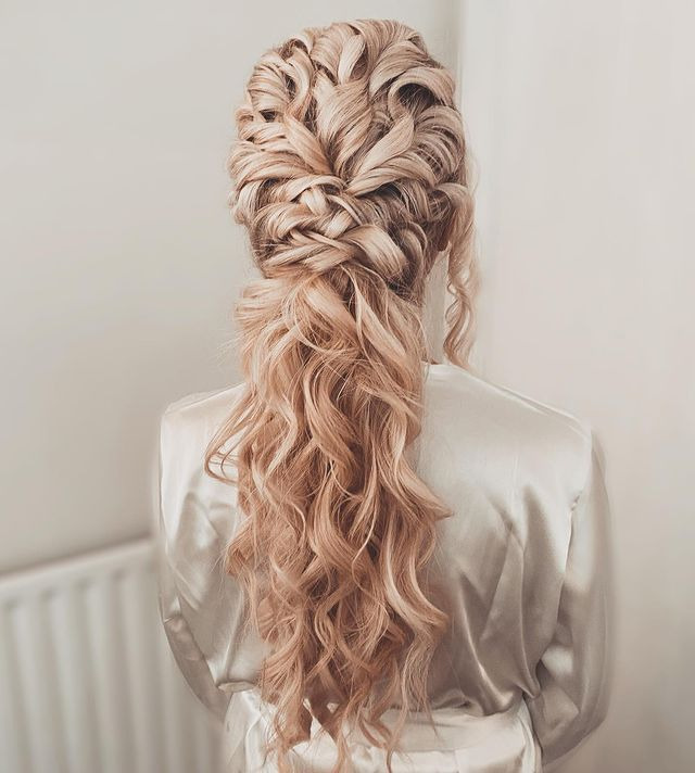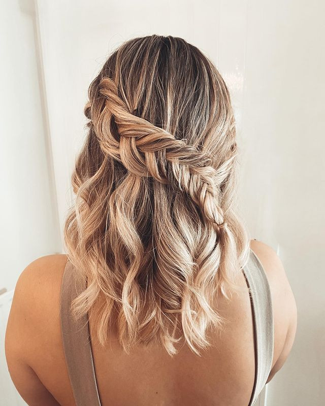 The hair is a beautifully braided fishtail braid that starts from the sides of the head and is then secured in the middle, leaving the rest of the hair in loose wavy locks. This style combines the elegance of a braid with the casual appeal of a half-up braid, making it a versatile option for formal events and more casual settings.