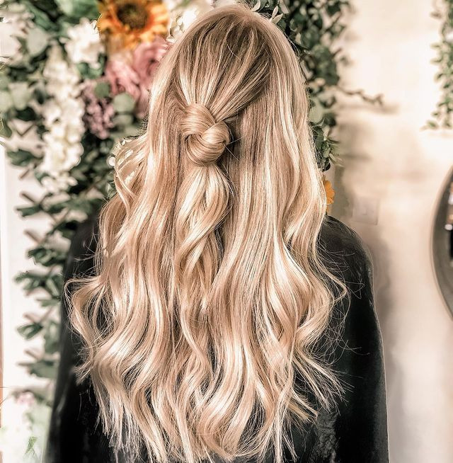 This hairstyle features a chic half-up knot that can be easily paired with soft cascading waves. The knot adds a simple yet elegant detail to flowing waves and is perfect for everyday and special occasions. This look is versatile and timeless, with a natural, relaxed vibe that will complement any outfit.