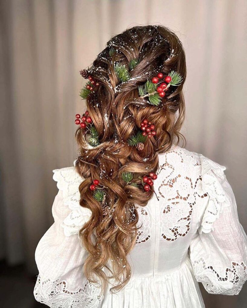 This hairstyle is called the Holiday Winter Braid with Holiday Accents. It features a beautiful intricate braid adorned with winter decorations such as faux berries, pine needles and faux snow. Cascading curls add a romantic touch, making this hairstyle perfect for holiday celebrations or winter weddings.