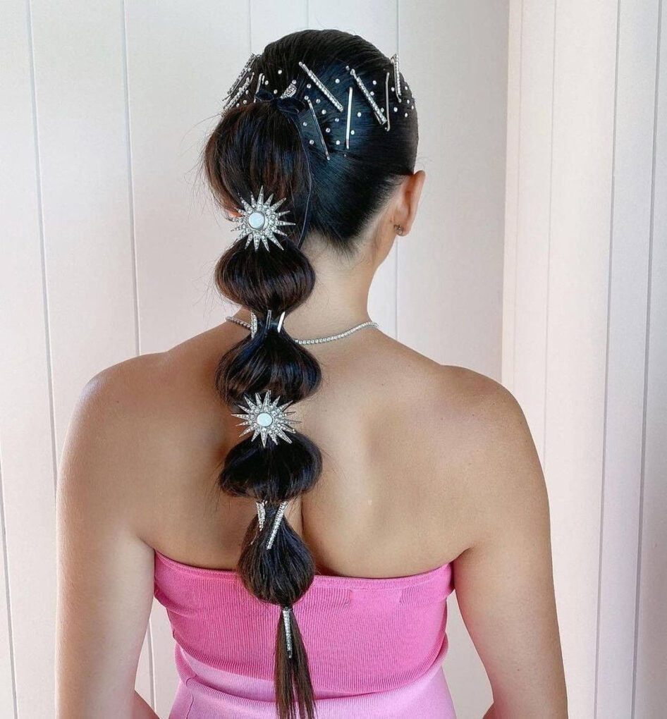 The look features a high ponytail divided into “bubbles” with elastic bands, each part of which is fluffed out to create volume. Adding sparkly embellishments and rhinestones throughout the ponytail and on the head enhances the style, making it glamorous and eye-catching, ideal for events or occasions when you want to stand out.