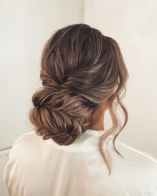 This hairstyle consists of softly twisted strands, loosely tied into a chic, voluminous bun at the back of the head. Adding a few strands to frame the face gives the hairstyle a romantic, casual look, perfect for a wedding, formal event or elegant evening out.