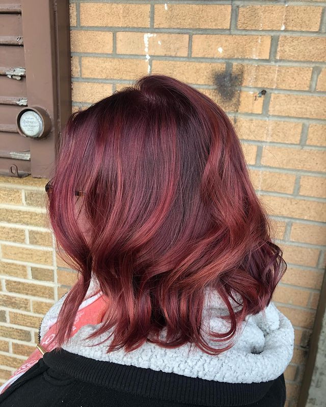 This hairstyle features a shoulder-length layered bob with soft waves in a deep burgundy color. Layers give hair movement and volume, while waves create effortless elegance. The vibrant color adds warmth and personality, making it a stylish and modern choice for those who want to add some flair to their look.