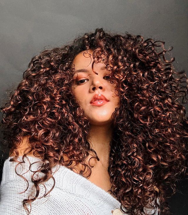This hairstyle showcases voluminous curly hair with chocolate balayage. Tight, bouncy curls create a stunning halo of texture and volume, while chocolate balayage adds depth and volume with rich, warm tones. This look is perfect for creating natural curls and adding a hint of color to highlight the natural movement and body of the hair.