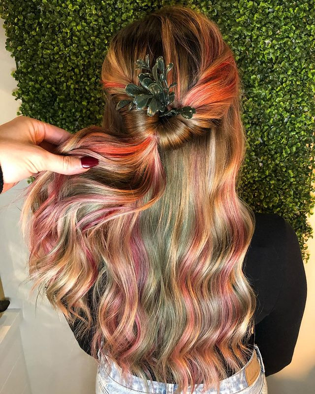 This adorable hairstyle combines earthy greens, oranges, and pinks to create a unique fall rainbow effect. Soft waves add texture and movement, while a half-up twist secured with a leaf clip enhances the natural forest vibe. This look is perfect for those who want to use fall colors in a subtle yet artistic way, making it perfect for outdoor gatherings or seasonal celebrations.