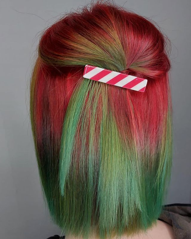 This hairstyle features vibrant red and green hues reminiscent of classic holiday candy canes. The ombre effect blends colors seamlessly to create a bold yet festive look. A candy cane hair accessory completes the style, adding a playful and seasonal touch to the overall look. It’s perfect for those who want to create a fun holiday hairstyle with their hair.