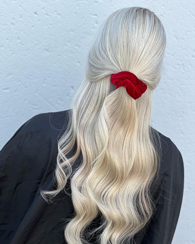 This hairstyle features long platinum blonde waves elegantly pulled back in a simple half-up look and secured with a vibrant red velvet hair tie. The rich texture of the scrunchie adds a festive look, contrasting beautifully with the sleek soft waves, creating a chic yet effortless look for any festive occasion.