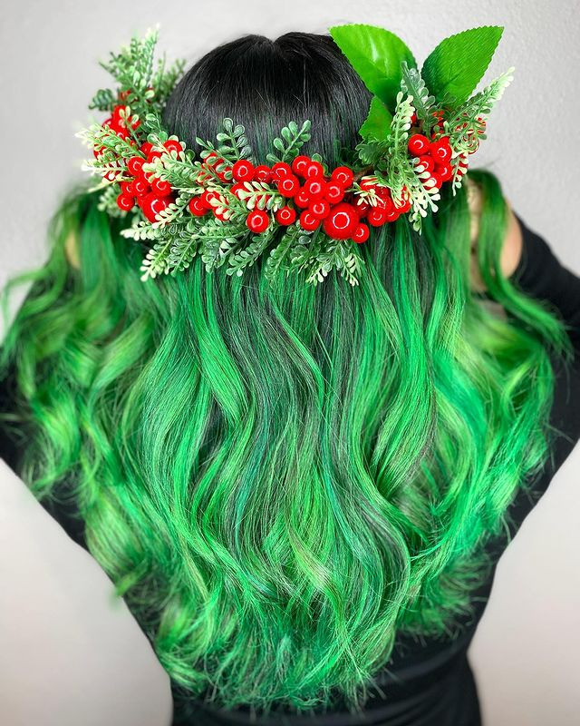 This holiday hairstyle brings the holiday spirit to life with vibrant green waves that resemble the lush greenery of a holiday wreath. The look is completed with a beautiful floral crown adorned with red berries and green leaves, adding a touch of natural elegance. This playful and eye-catching style is perfect for those who want to celebrate the season with boldness and creativity.
