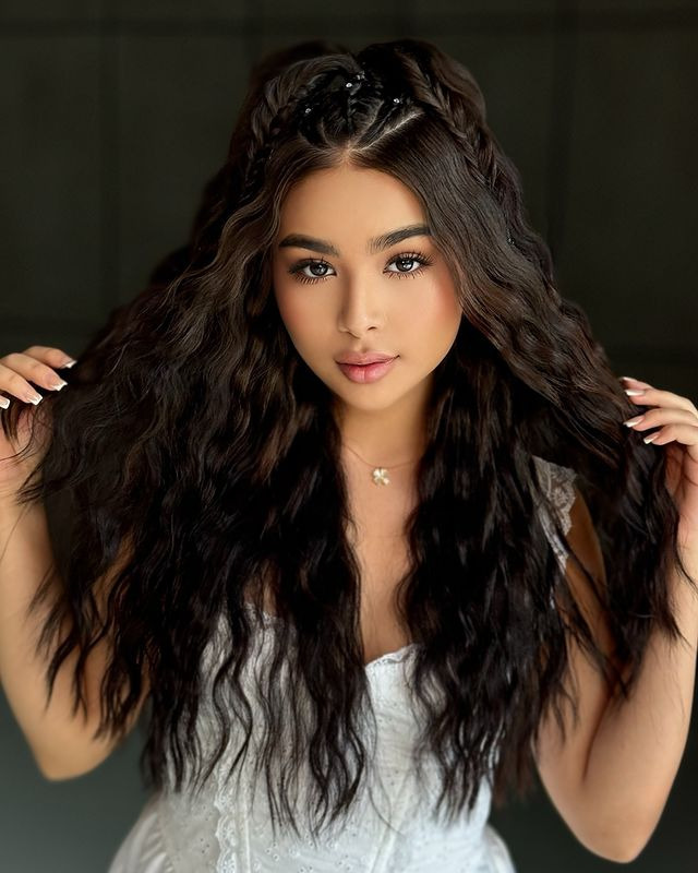 This hairstyle features voluminous wavy waves that add texture and proportion to the hair, creating a bold and fashionable look. The top part is styled as a twisted half-updo, adding playful and intricate details to enhance the overall style. This look is perfect for those who want to make a statement with their hair while maintaining a casual chic vibe. This hairstyle is perfect for casual outings and more formal events. It combines texture and elegance in a fun, youthful way.