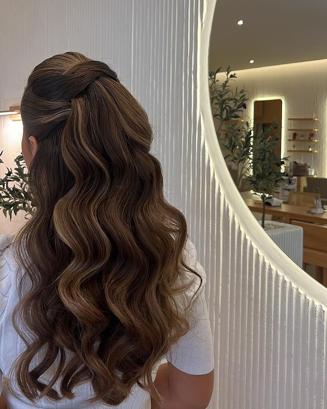 The wavy half updo is a beautiful and versatile hairstyle that combines loose waves and an elegant half updo. Start by curling your hair to create soft, voluminous waves. Then pull the top half of your hair back, securing it with a clip or elastic. This look is perfect for any occasion, combining casual waves with a sophisticated updo, giving you a romantic and sophisticated look.