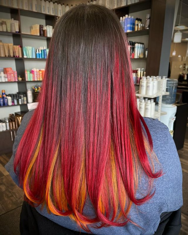 Sunset Ombre captures the vibrant and mesmerizing colors of a sunset, creating a stunning hair transformation. This look transitions from deep dark roots to a mixture of fiery reds, oranges and yellows, mimicking the beautiful gradient of the setting sun. Ideal for those looking to make a bold and dynamic statement, sunset ombre will add warmth, energy and a touch of the exotic to your hairstyle, ensuring you stand out with this eye-catching and radiant look.
