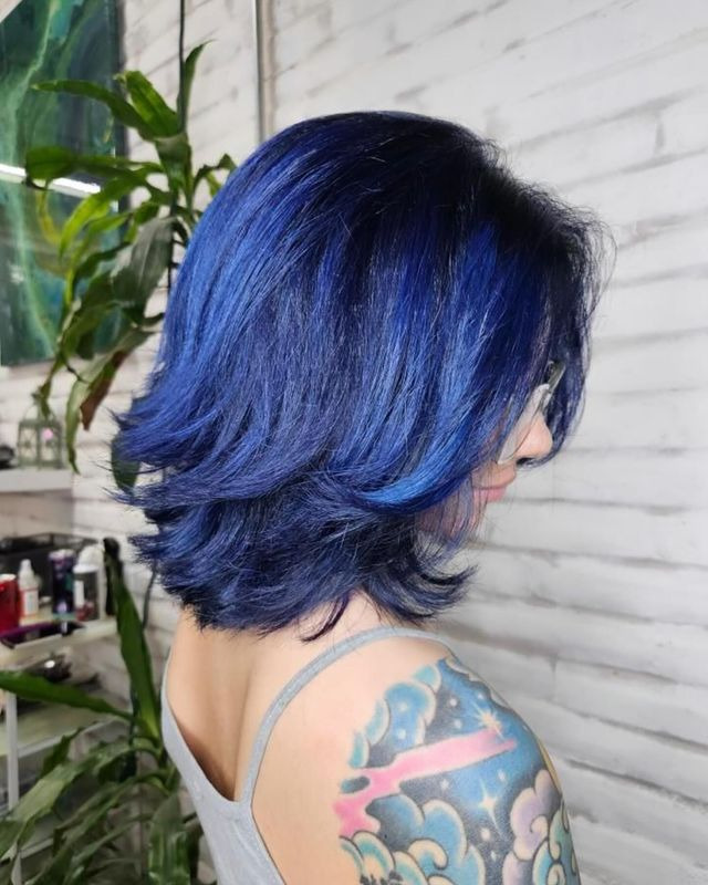 The denim blue ombre is a trendy and unique style that gives your hair a casual and edgy look. This look transitions from dark roots to dark blue denim tips, creating a vibrant and smooth gradient. Ideal for those who want to make a bold fashion statement, denim blue ombre gives a fresh and modern look with rich blue tones.
