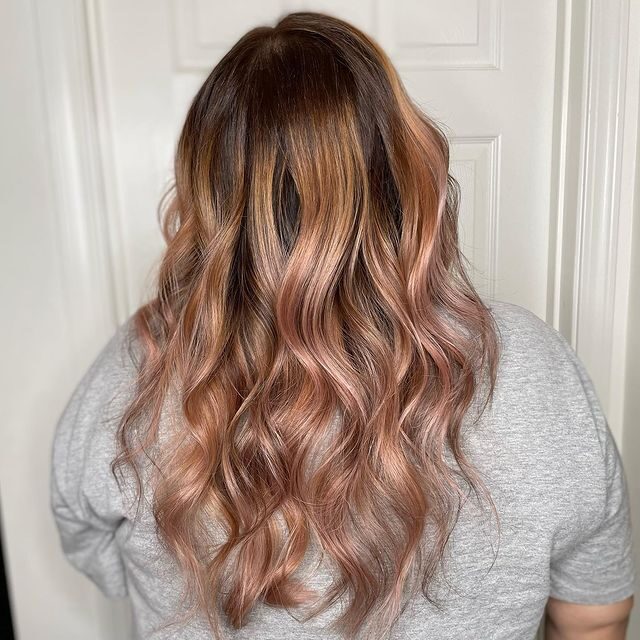 Мелирование из розового золота придаст вашим волосам мягкий, романтический оттенок благодаря сочетанию нежных розовых и золотистых оттенков. Теплые тона придают вашим волосам тонкий, сияющий эффект, игривый, но утонченный. Эти блики идеально подходят для добавления ярких цветов, которые по-прежнему удобны и элегантны, плавно сочетаясь с естественными оттенками, создавая объемный, освещенный солнцем образ. Блеск из розового золота — это свежо и модно, оно привносит мечтательный и современный оттенок в любой стиль.