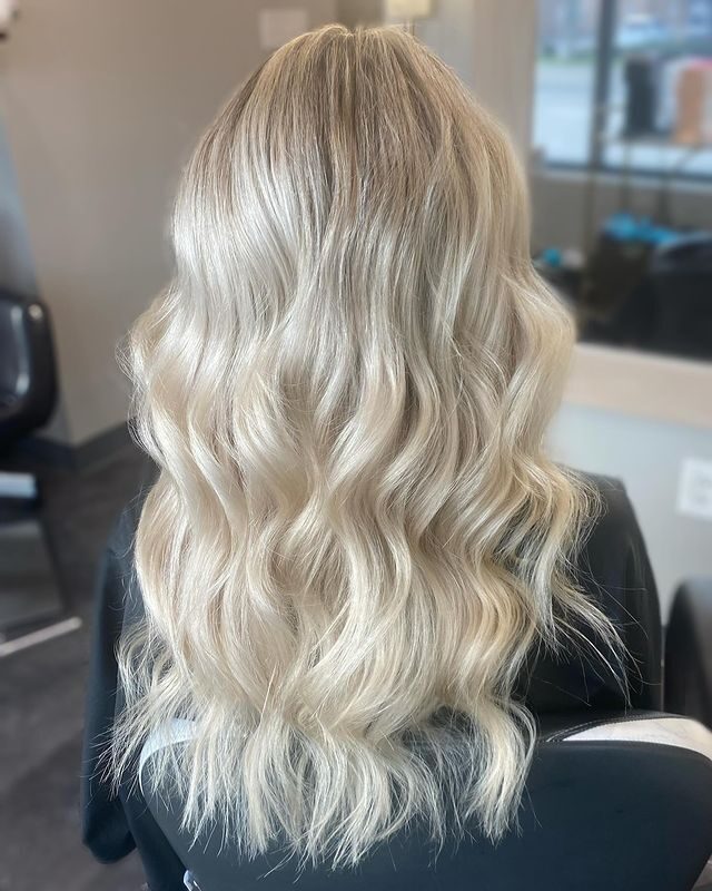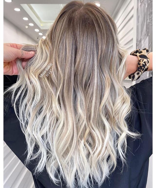 Балаяж ледяного блонда создает прохладный, морозный, смелый, но в то же время непринужденно шикарный образ. Нарисованные вручную блики начинаются с более темных корней и плавно переходят в ледяные платиновые тона от середины длины до кончиков. Этот мягкий градиент добавляет глубину и объем, придавая вашим волосам гладкий и сияющий вид. Это идеальный способ использовать яркие, прохладные тона, не прибегая к сплошному цвету. Балаяж ледяной блондинки — это современно, эффектно и полно вау-фактора.
